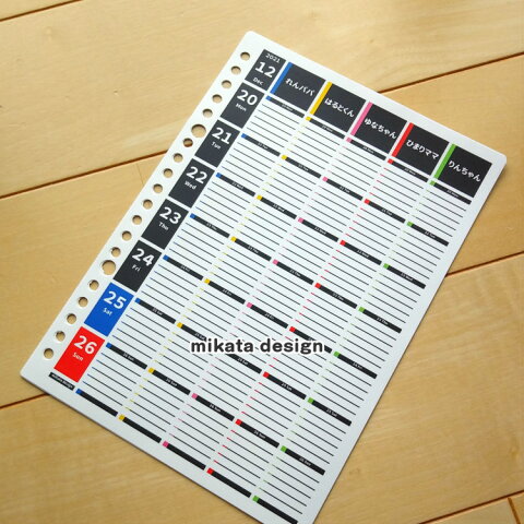 ウィークリーNタイプ【 New Page 】 1か月ごとに分けたい方へ 12か月分 4,200円 ウィークリーCタイプ【 Continue 】 週の途中で月がかわっても そのまま続ける節約タイプ 〔1か月ごとに分けられません〕 12か月分 3,650円 マンスリータイプ 1日1行で1か月を管理 12か月分 1,650円みんなのスケジュール ◆ルーズリーフのみの商品です ◆こちらはNタイプです ひと月ごとに分けられます 商品データ 人 数 5人用 人数を 変更する▶ タイプ ウィークリーNタイプ ? タイプを 変更する▶ テーマ ブラックカラー テーマを 変更する▶ 月 数 12か月分 1か月分〜は準備中▶ *Nタイプの特徴* 週の途中で月が替わると ページを新しくします ◆ひと月ごとに分けられます◆ 商品説明 商品名 みんなのスケジュール 人数 列数 5人用 5列 タイプ ウィークリーNタイプ ひと月ごとに分けられます 週の途中で月が替わるとページを新しくします (裏無地タイプ) 期間・枚数 12か月分・約64枚 テーマ ブラックカラー 始まり年月 2021年1月始まり 2021年2月始まり 2021年3月始まり 2021年4月始まり 2021年5月始まり 2021年6月始まり 2021年7月始まり 2021年8月始まり 2021年9月始まり 2021年10月始まり 2021年11月始まり 2021年12月始まり 2022年1月始まり 2022年2月始まり 2022年3月始まり 2022年4月始まり 1日の行数 1日1〜6行 各列のカラー ブラックカラー レッド ブラウン オレンジ イエロー イエローグリーン グリーン ターコイズ スカイブルー ブルー パープル マゼンタ ピンク ローズ ブラック 裏面の様式 無地タイプ 用紙のサイズ ・A5サイズ(20穴) 縦210×横148mm ・B5サイズ(26穴) 縦257×横182mm ・A4サイズ(30穴) 縦297×横210mm 上記のうち いずれか 材質 ルーズリーフ 注意事項 ◆月別ウィークリーNタイプのみ、ルーズリーフのみの商品です。