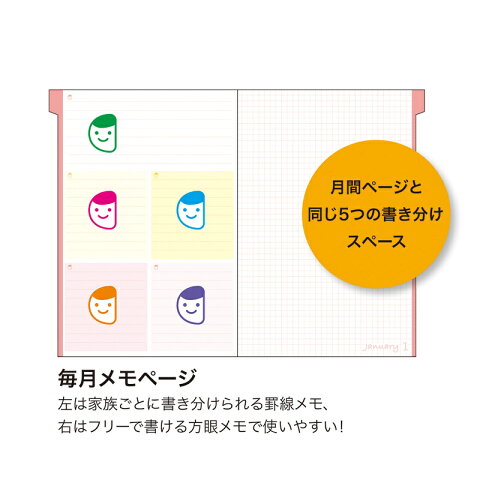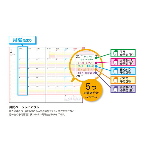特徴●家族の予定が”もっと”分けて書ける手帳です●編集タイプ「F-2a」●A5・薄型サイズ/64ページ●月曜始まり月間スケジュールページの1日の枠を色のラインで区分けしているので、家族の予定が書きやすく見やすい手帳です。